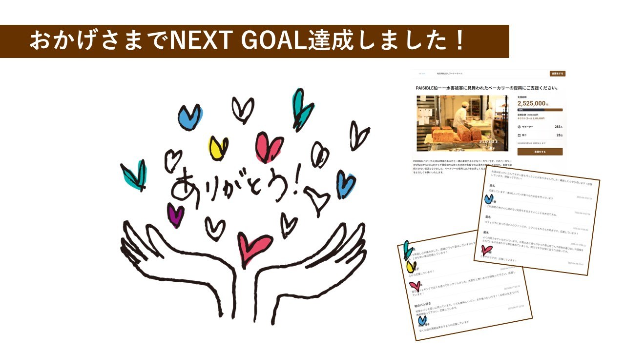 2023-06-20 15:00おかげさまでNEXT GOAL達成しました!ありがとうございます。2023年6月16日に開始したPAISIBLE柏店-水害復興クラウドファンディングは、地域のたくさんの方々の応援をいただき、3日間でファーストゴール(150万円)達成し、5日間でネクストゴール(250万円)を達成いたしました。ふさわしい言葉が見つからないくらい感謝と驚きでいっぱいです。本当にありがとうございました!2023-06-20 15:00おかげさまでNEXT GOAL達成しました!ありがとうございます。2023年6月16日に開始したPAISIBLE柏店-水害復興クラウドファンディングは、地域のたくさんの方々の応援をいただき、3日間でファーストゴール(150万円)達成し、5日間でネクストゴール(250万円)を達成いたしました。ふさわしい言葉が見つからないくらい感謝と驚きでいっぱいです。本当にありがとうございました!