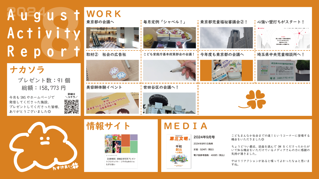 2024-10-04 15:418月の活動報告通信を発行しました📮遅くなりましたが、毎月発行している活動報告を簡単にお知らせいたします。2024-10-04 15:418月の活動報告通信を発行しました📮遅くなりましたが、毎月発行している活動報告を簡単にお知らせいたします。