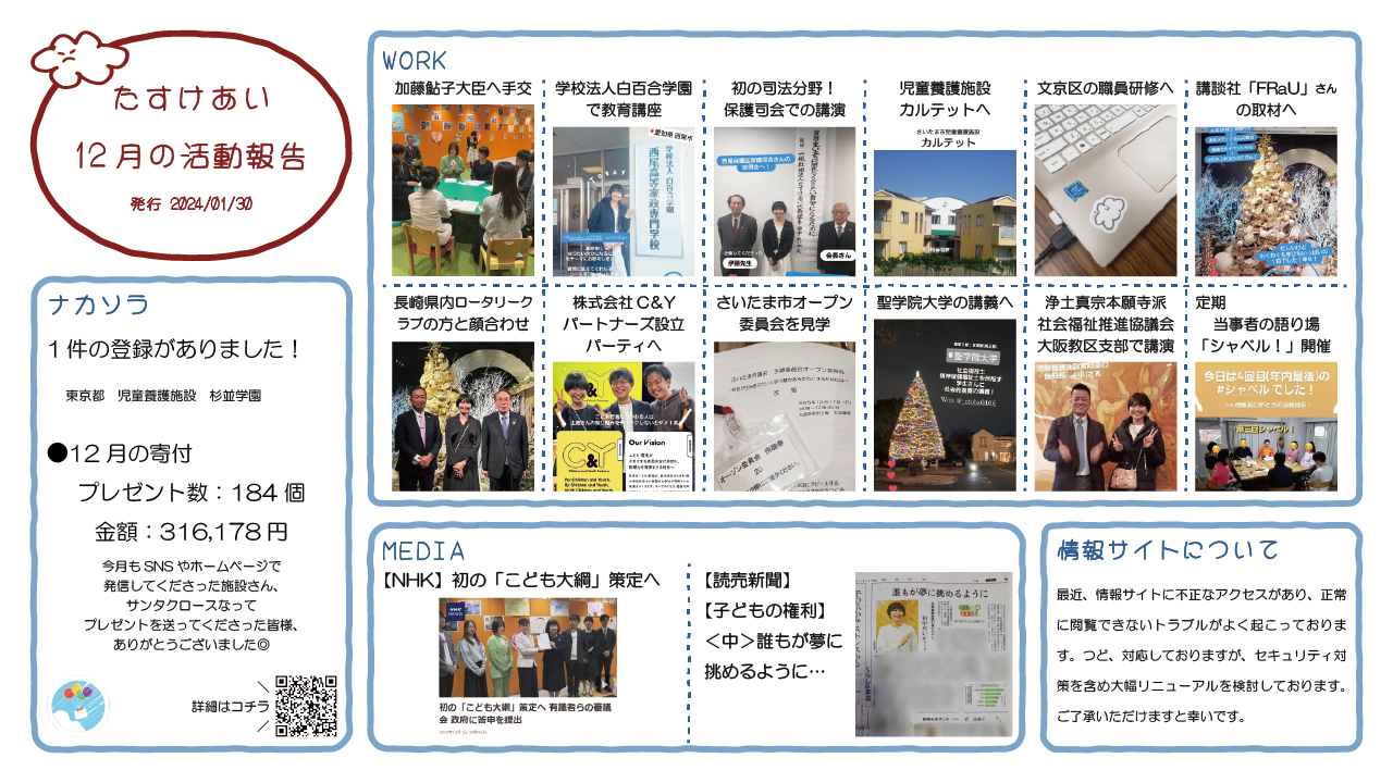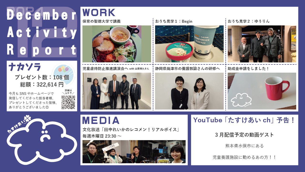 2025-02-26 15:3712月の活動報告通信を発行しました📮遅くなりましたが、毎月発行している活動報告を簡単にお知らせいたします。2025-02-26 15:3712月の活動報告通信を発行しました📮遅くなりましたが、毎月発行している活動報告を簡単にお知らせいたします。