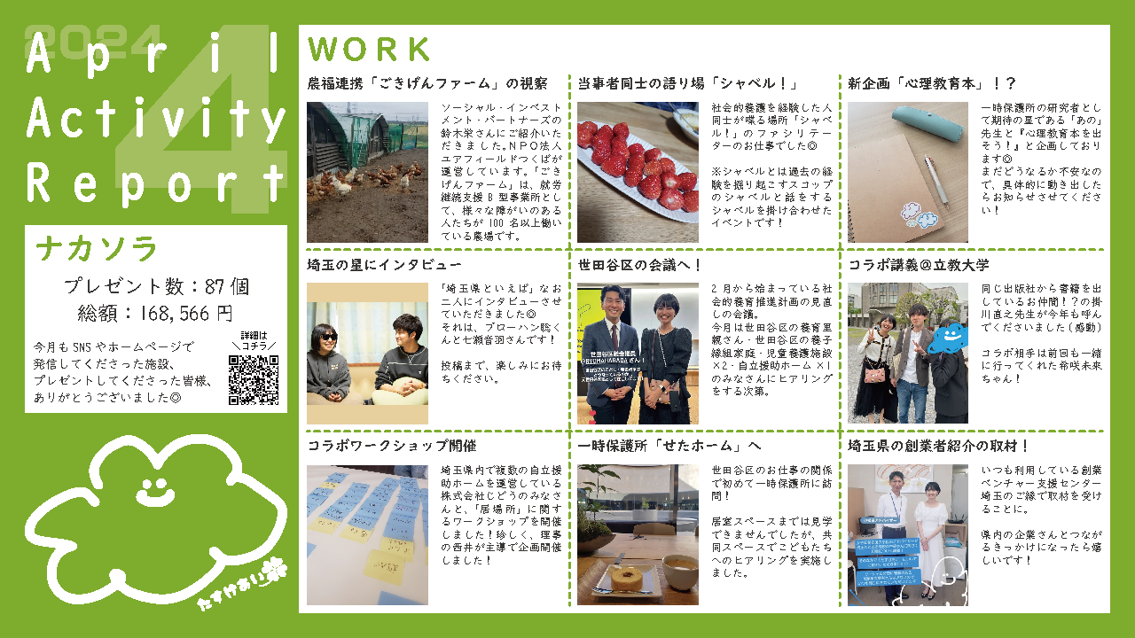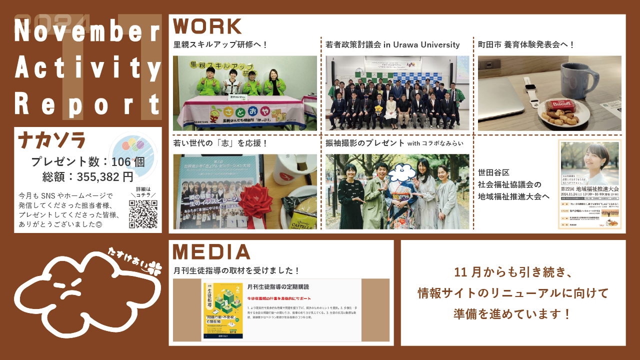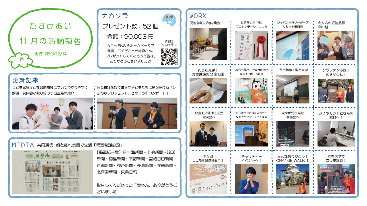 2023-12-14 17:0811月の活動報告通信を発行しました📮\いつも応援ありがとうございます!/ ☁マンスリーサポーターのみなさまには毎月の活動報告メールマガジン「ゆる月報」をお送りしております。 ☁代表の著書『児童養護施設という私のおうち(旬報社)』も好評発売中!Amazonレビューをぜひお願いします!→ https://amzn.asia/d/6hLsmaM2023-12-14 17:0811月の活動報告通信を発行しました📮\いつも応援ありがとうございます!/ ☁マンスリーサポーターのみなさまには毎月の活動報告メールマガジン「ゆる月報」をお送りしております。 ☁代表の著書『児童養護施設という私のおうち(旬報社)』も好評発売中!Amazonレビューをぜひお願いします!→ https://amzn.asia/d/6hLsmaM