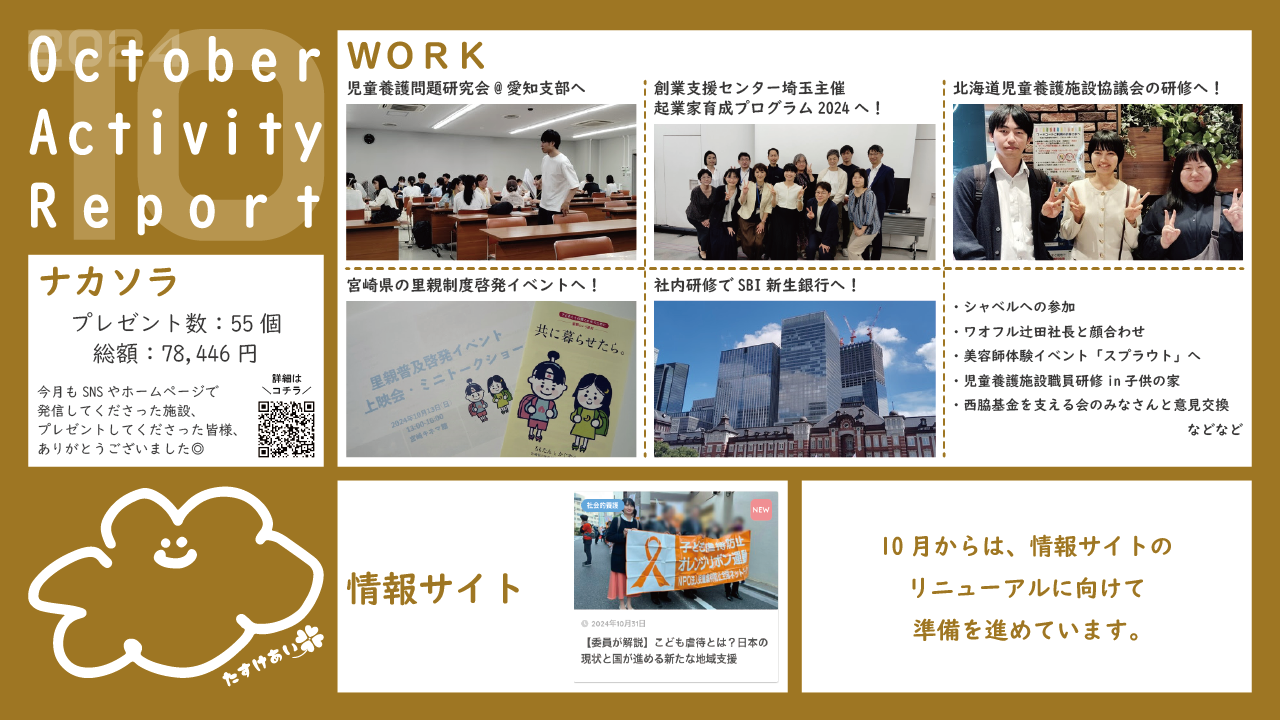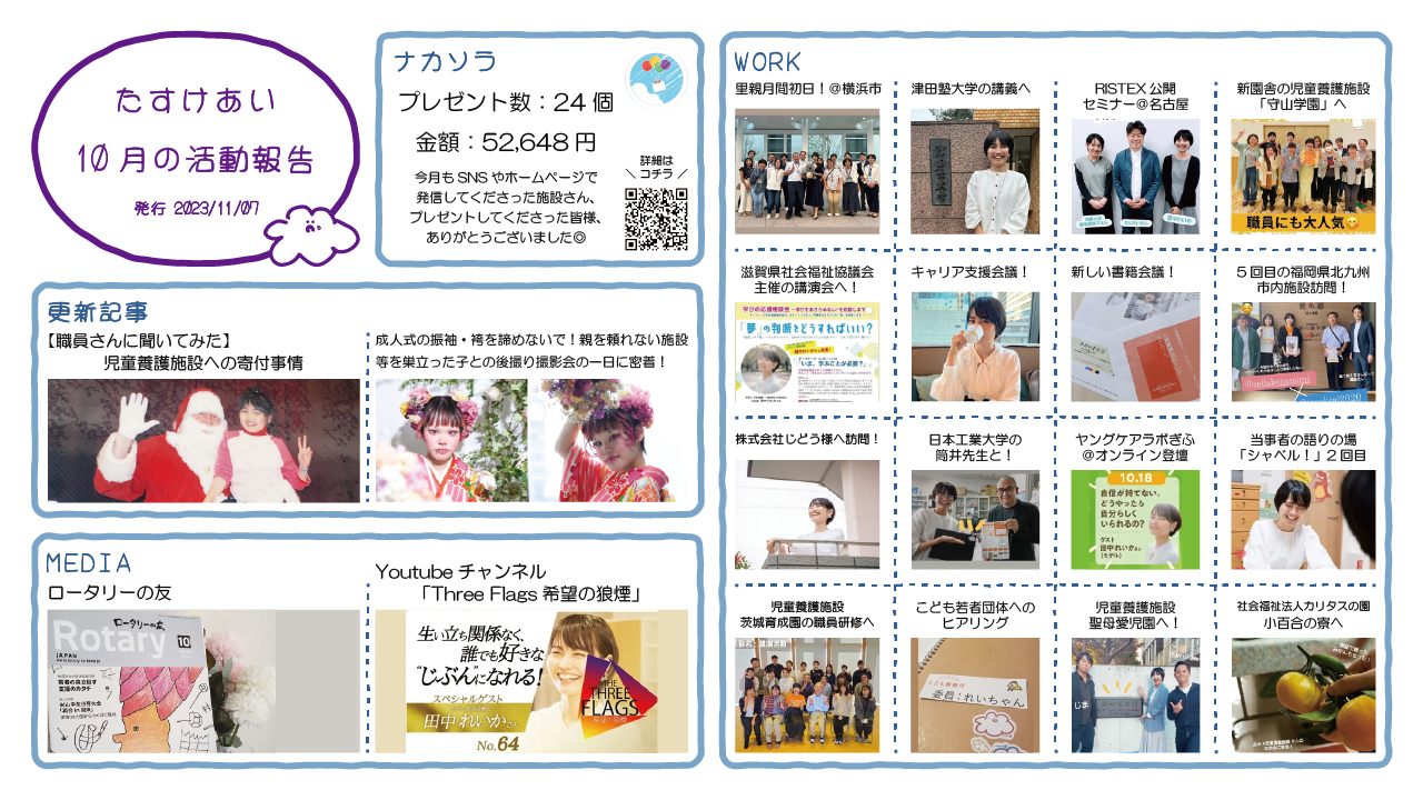 2023-11-05 10:0010月の活動報告通信を発行しました📮\いつも応援ありがとうございます!/ ☁マンスリーサポーターのみなさまには毎月の活動報告メールマガジン「ゆる月報」をお送りしております。 ☁代表の著書『児童養護施設という私のおうち(旬報社)』も好評発売中!Amazonレビューをぜひお願いします!→ https://amzn.asia/d/6hLsmaM2023-11-05 10:0010月の活動報告通信を発行しました📮\いつも応援ありがとうございます!/ ☁マンスリーサポーターのみなさまには毎月の活動報告メールマガジン「ゆる月報」をお送りしております。 ☁代表の著書『児童養護施設という私のおうち(旬報社)』も好評発売中!Amazonレビューをぜひお願いします!→ https://amzn.asia/d/6hLsmaM