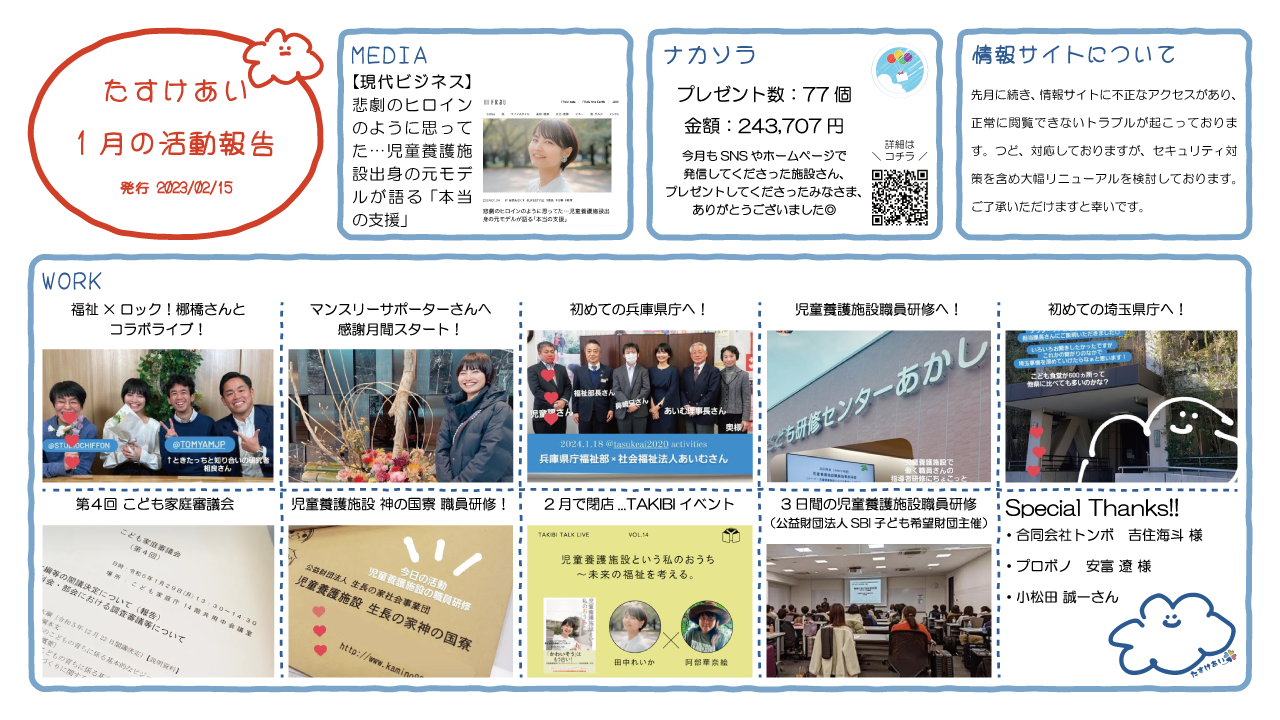 2024-02-28 10:371月の活動報告通信を発行しました📮\いつも応援ありがとうございます!/ ☁マンスリーサポーターのみなさまには毎月の活動報告メールマガジン「ゆる月報」をお送りしております。 ☁代表の著書『児童養護施設という私のおうち(旬報社)』も好評発売中!Amazonレビューをぜひお願いします!→ https://amzn.asia/d/6hLsmaM2024-02-28 10:371月の活動報告通信を発行しました📮\いつも応援ありがとうございます!/ ☁マンスリーサポーターのみなさまには毎月の活動報告メールマガジン「ゆる月報」をお送りしております。 ☁代表の著書『児童養護施設という私のおうち(旬報社)』も好評発売中!Amazonレビューをぜひお願いします!→ https://amzn.asia/d/6hLsmaM