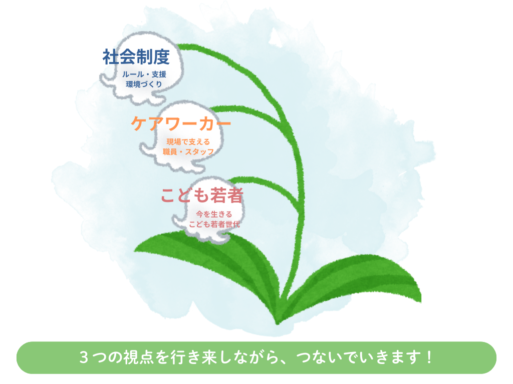 一見すると、どっちつかずに見えるかもしれません。けれど、社会制度、ケアワーカー、こどもや若者、この3つの視点を行き来しながら関係をつないでいくことこそが、私の活動の軸だと思うようになりました。