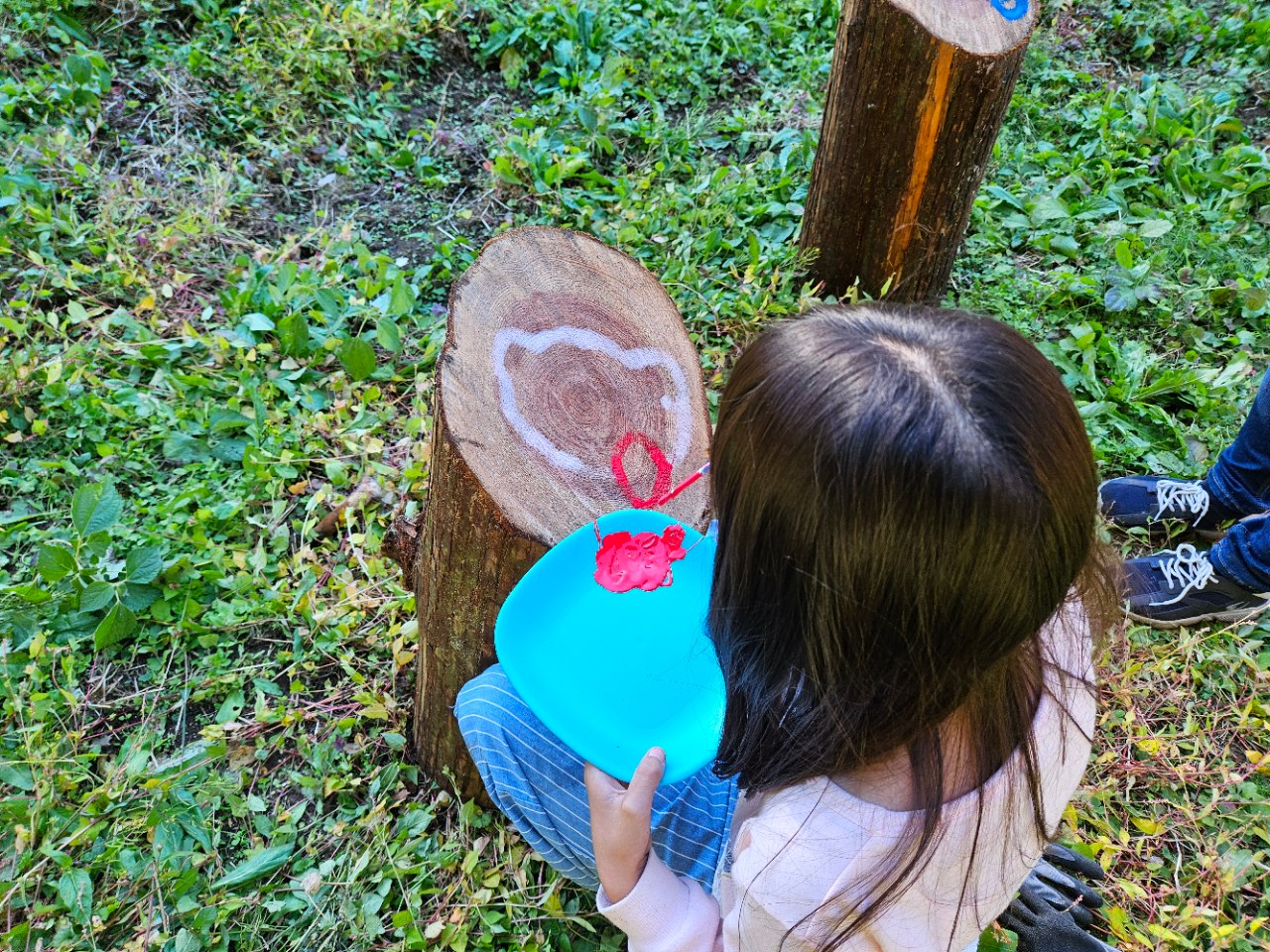 子どもたちは、森の遊具で大はしゃぎ。丸太にお絵かきをして、森の飾り付けもしてくれました。ハイキングや野外クッキングもして、里山を遊び尽くした一日となりました。