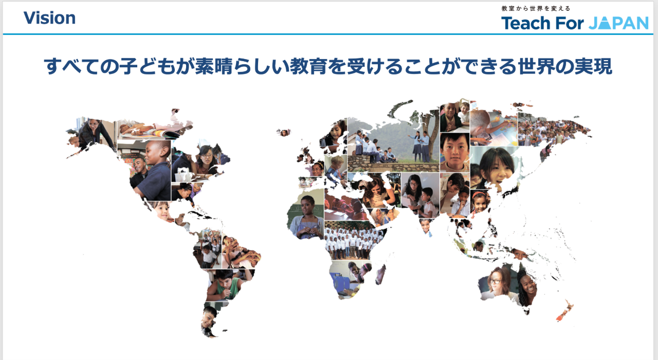 私たちは、世界60ヵ国以上に広がるTeach For Allというグローバルネットワークの一員で、「すべての子どもが、素晴らしい教育を受けることができる世界の実現」をビジョンに掲げています。 主な事業は、教育を通して社会をより良くしたいと考える多様な人材募集し、選考・研修を通して育み、2年間「教室」に教師として送り出すフェローシップ・プログラムの実施です。