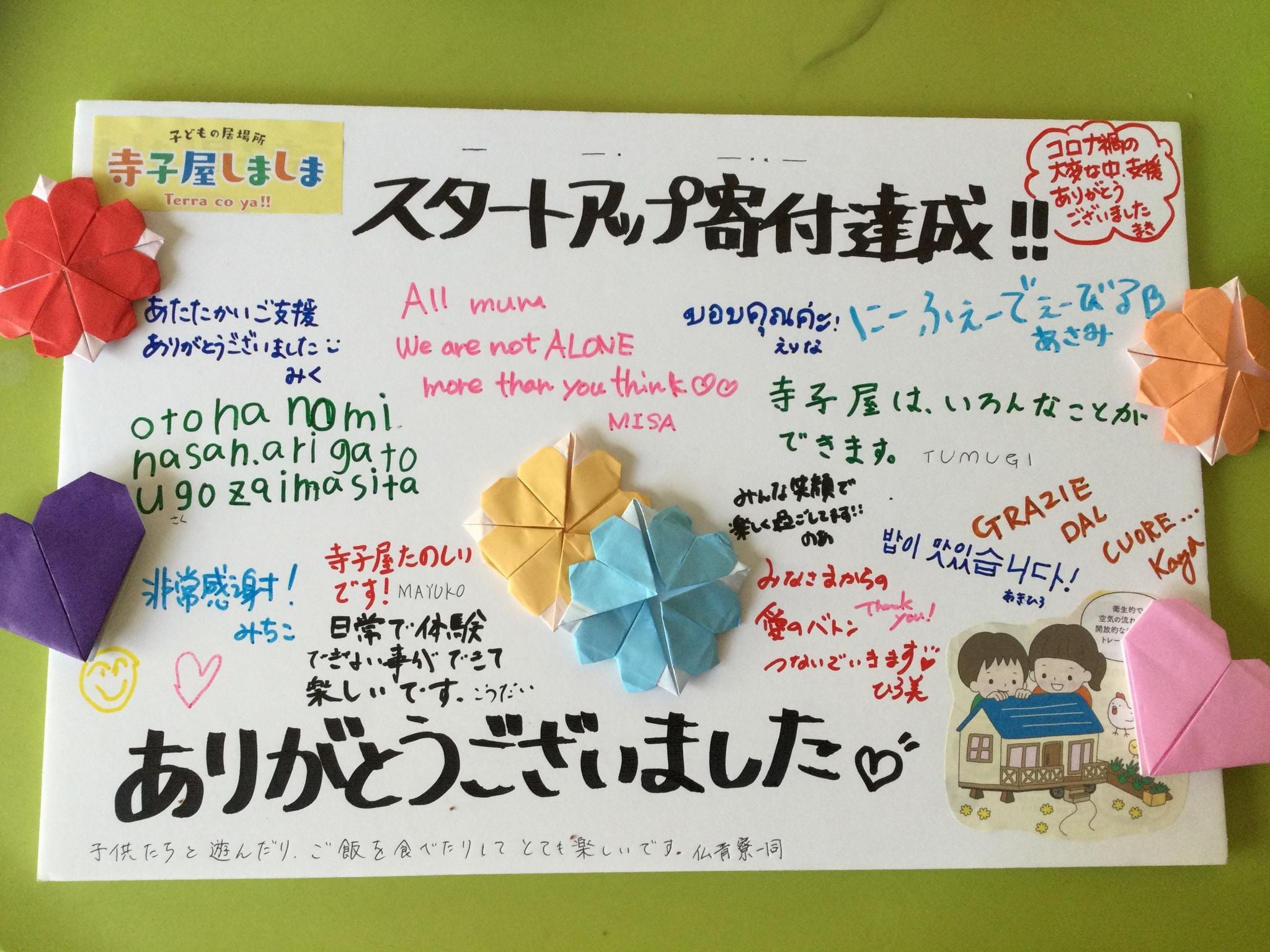 活動実績のない開校前から、やりたいこと、やる予定のこと、心意気を伝えさせていただき、法人個人合わせて214名様よりご支援を頂き、見事目標達成致しました(3,156,040円)。