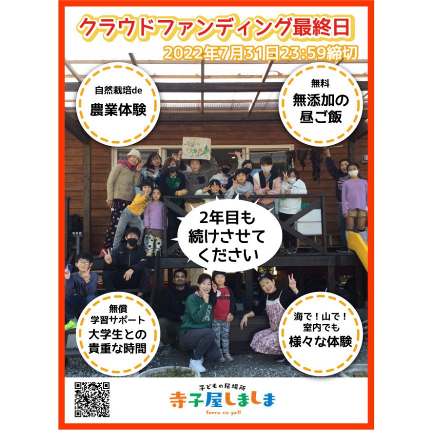 あまりの忙しさに寝込んでしまい、ホームページ更新もさほどできないまま、最終日を迎えることとなりました。 本日23時59分が締め切りです。 コロナも蔓延しており、病床からクレジット決済してくれる方、ご自身も大変な中、気持ちを寄せてくださる方、大変ありがとうございます! 2年目もかけがえのない貴重な経験ができる無償の子どもの居場所として、精進して参りますので、あと一押しのご支援をよろしくお願い致します。