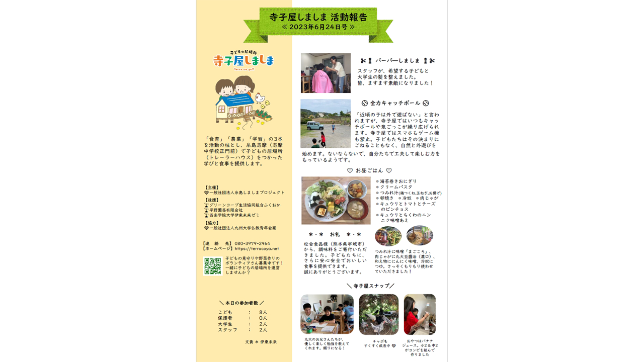 一般社団法人糸島しましまプロジェクトは、福岡県糸島市で「子どもの居場所寺子屋しましま」を運営しています。2021年8月1日の開校以来、訪れた子どもの数はコロナ過でありましたが、847人(2023年5月末現在)にのぼり、毎週元気な子ども達の笑い声がこだましています。