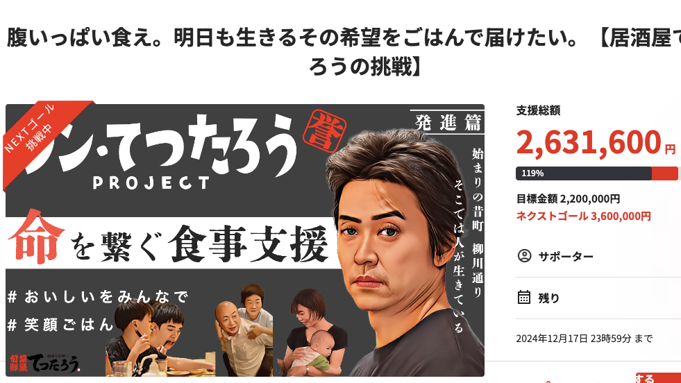 2024-12-03 13:33ネクストゴールを設定しました!こんにちは。てつたろうスタッフのさやかです。この度、命を繋ぐ食事支援てつたろうクラウドファンディングの目標を達成しましたので、ネクストゴールを設けさせていただきました。内容は動画に収めておりますので、是非ご覧いただければと思います!残りの期間が約2週間ほどになりますが、最後まで応援よろしくお願いします。 ネクストゴールはこちら https://congrant.com/project/tetsutarou/118362024-12-03 13:33ネクストゴールを設定しました!こんにちは。てつたろうスタッフのさやかです。この度、命を繋ぐ食事支援てつたろうクラウドファンディングの目標を達成しましたので、ネクストゴールを設けさせていただきました。内容は動画に収めておりますので、是非ご覧いただければと思います!残りの期間が約2週間ほどになりますが、最後まで応援よろしくお願いします。 ネクストゴールはこちら https://congrant.com/project/tetsutarou/11836