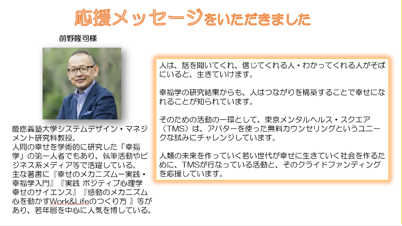 「幸福学」の第一人者 前野隆司慶應義塾大学教授から応援メッセージをいただきました