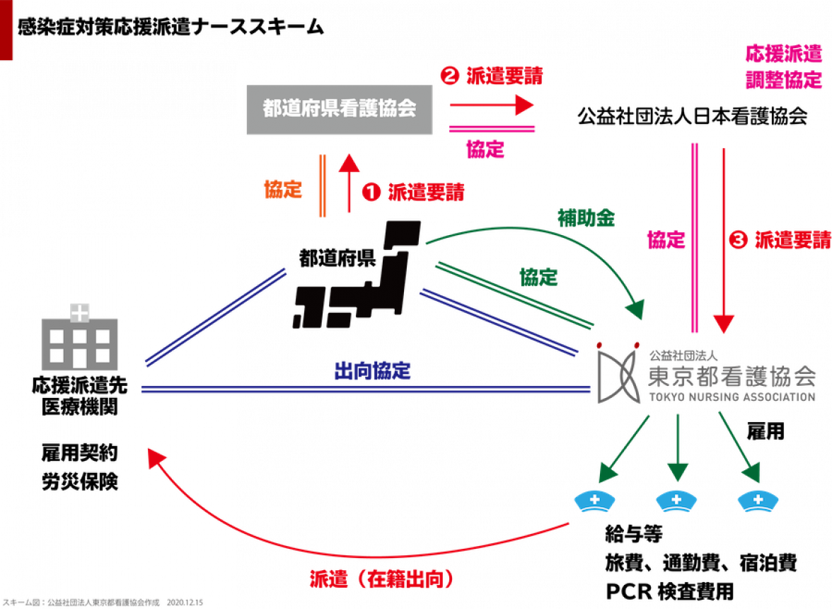 2.この覚書に基づき、当協会は、東京都からの派遣要請を受け、都内の医療機関(対象となった施設数3)に対し、当協会で雇用する9名の看護職員の派遣実施。