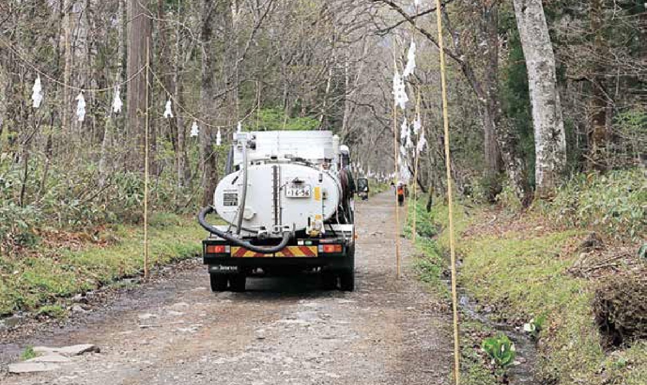中でも施設・設備の不備として、トイレ不足を解決しなければなりません。奥社参道内の公衆トイレは一つしかないため、参拝者の負担が大きく、繁忙期にはオーバーユースとなっています。トイレは汲取り式を採用せざるを得ず、管理用車両の通行増加の一因となっているため、車両の通行や参拝者の踏圧により、スギ根系の損傷が懸念されています。