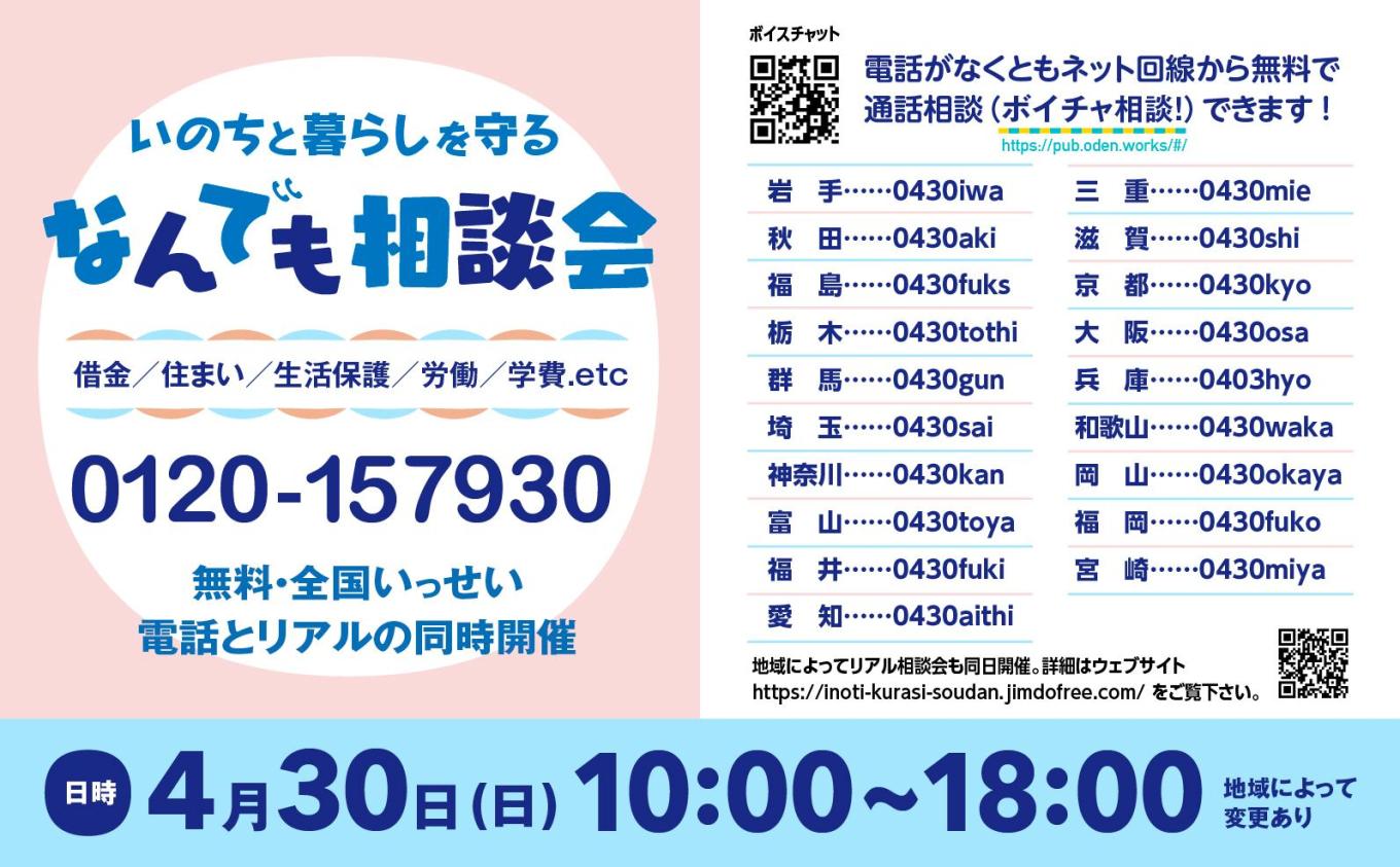 そして今週日曜(4月30日)開催される「いのちと暮らしを守るなんでも相談会(電話+リアル同時開催)」に「ボイチャ相談!」として、電話を失った方でもフリーWi-Fi等から相談電話にかけられる仕組みを提供・連携協力させていただいています!