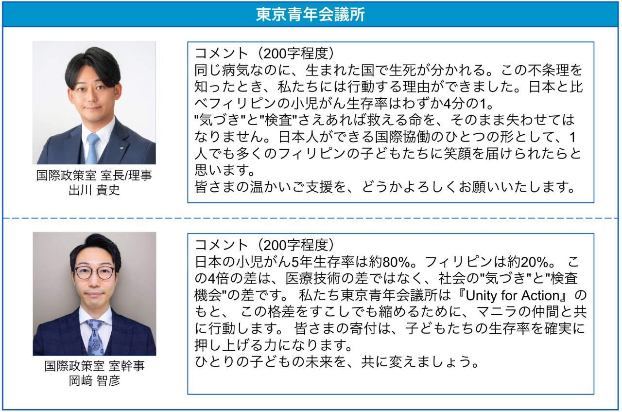 このプロジェクトでは、「ただ寄付をする」という一方的な行為ではなく、子どもや大人たちに早期発見という啓発機会を提供し、持続可能な支援を行うことを目的としています。また東京青年会議所メンバーが2026年1月末に現地を訪問、視察し、それからも、現地の支援者たちと対話を重ね、本当に必要な支援は何かを考えながらこのプロジェクトを進めています。2026年8月には支援を通じて行う啓発運動も予定しており、資金が有益に使用されるようしっかりとしたフォローも行います。