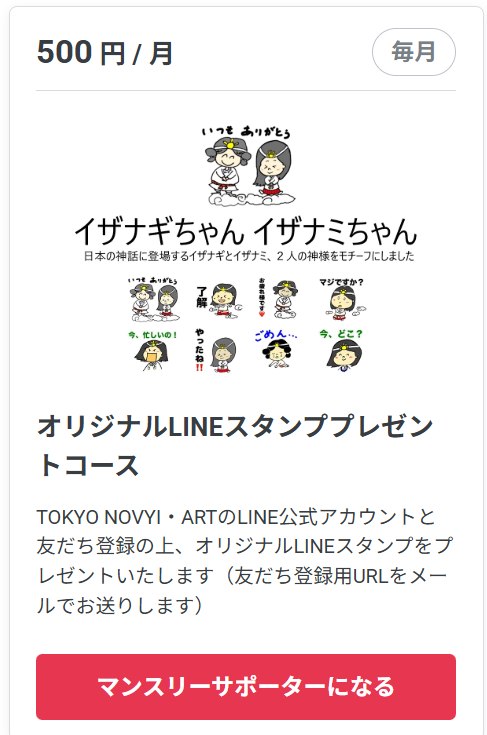 初回は、認定NPO法人 TOKYO NOVYI・ARTオリジナルのLINEスタンプを無料でプレゼントさせていただきます。レパートリー「古事記」にちなんで、イザナギとイザナミ2人の神さまをモチーフにしました。次回は紫式部をモチーフにしたスタンプを準備する予定です。どうぞお楽しみに。