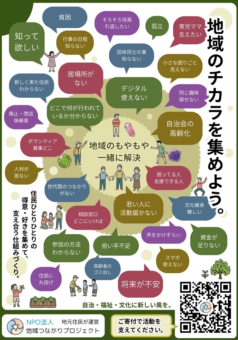 2023年に、地元エンジニアが社協さんと出会い、プロジェクトが開始しました。地域に埋もれるグループや、住民ひとりひとりの「得意・好き」を見える化しミックスする事で、「地域の支え手」へと導き、世代を超えてお互いに支え合える、地域共生社会の基盤を作る事を目指した団体です。