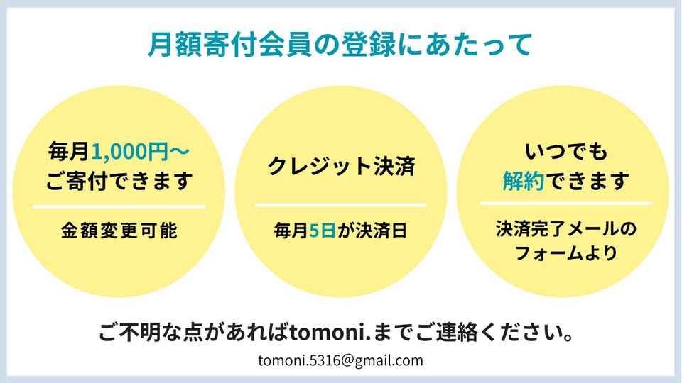 以前より継続にサポートしてくださっている方が、このキャンペーンを機に【増額】してくださりました!!!!そんな応援の方法があったのですね🌈ありがとう!! ちなみに月額寄付はいつでも解約できます。 不安なことや分からないことがあれば、いつでもtomoni.(いつみかヒロでも)に連絡くださいね🚩