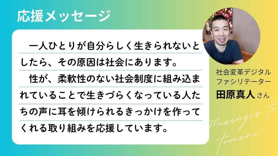 「一人ひとりが自分らしく生きられないとしたら、その原因は社会にあります。性が、柔軟性のない社会制度に組み込まれていることで生きづらくなっている人たちの声に耳を傾けられるきっかけを作ってくれる取り組みを応援しています。」社会変革デジタルファシリテーター田原真人さん