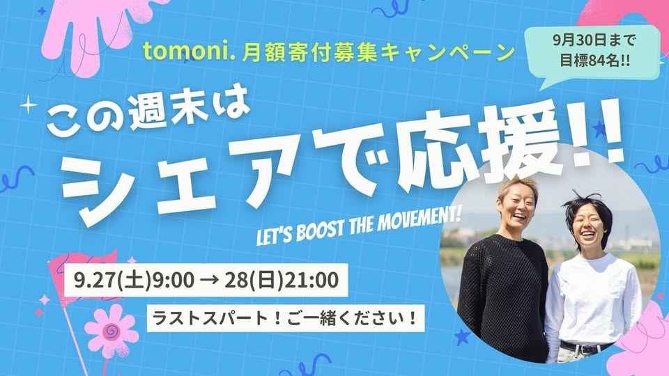 ▼この週末はシェアでtomoni.を応援📣 9/27 9:00-9/28 21:00 はSNSシェア強化の2日間🙌ぜひご協力ください!