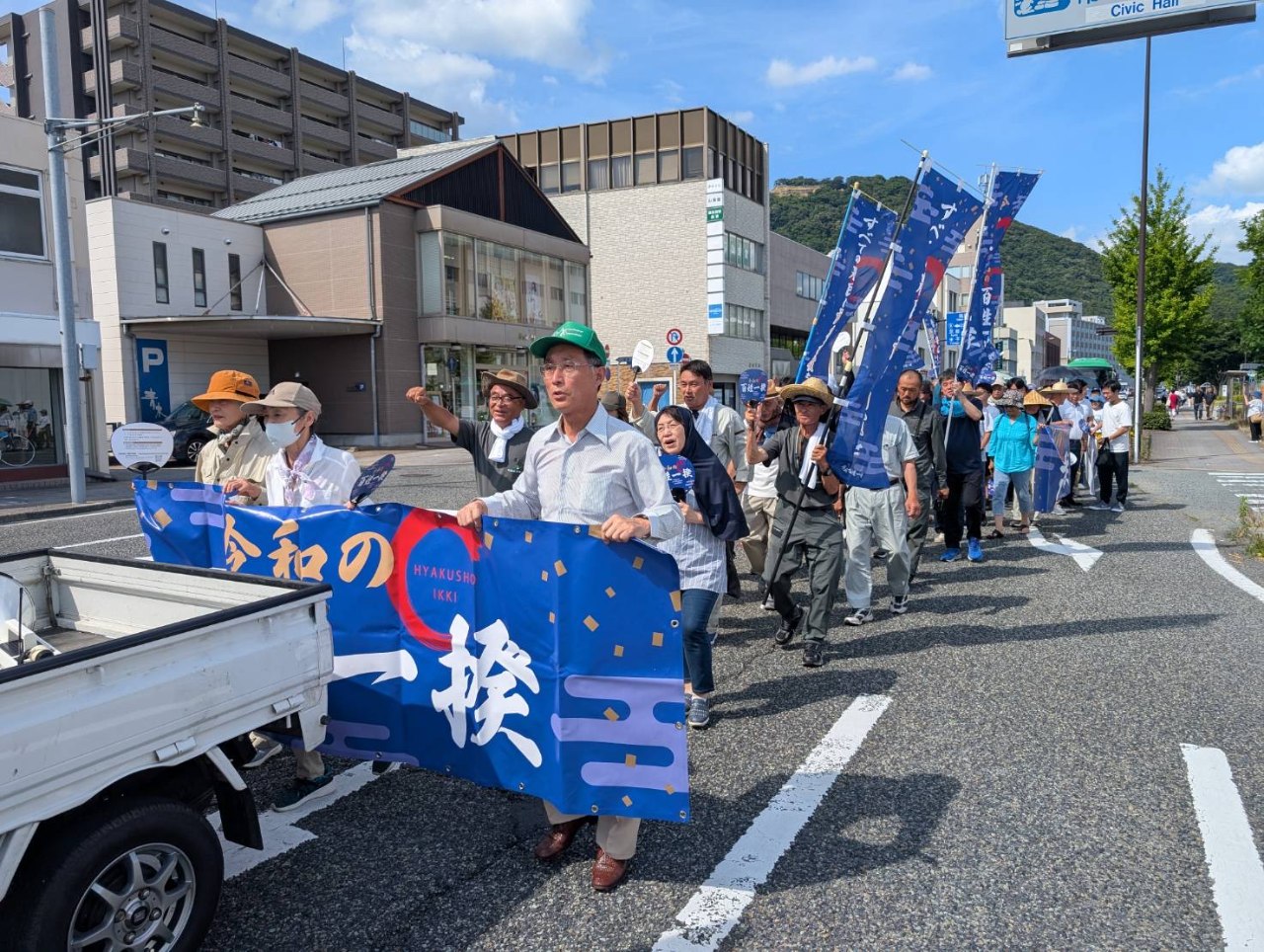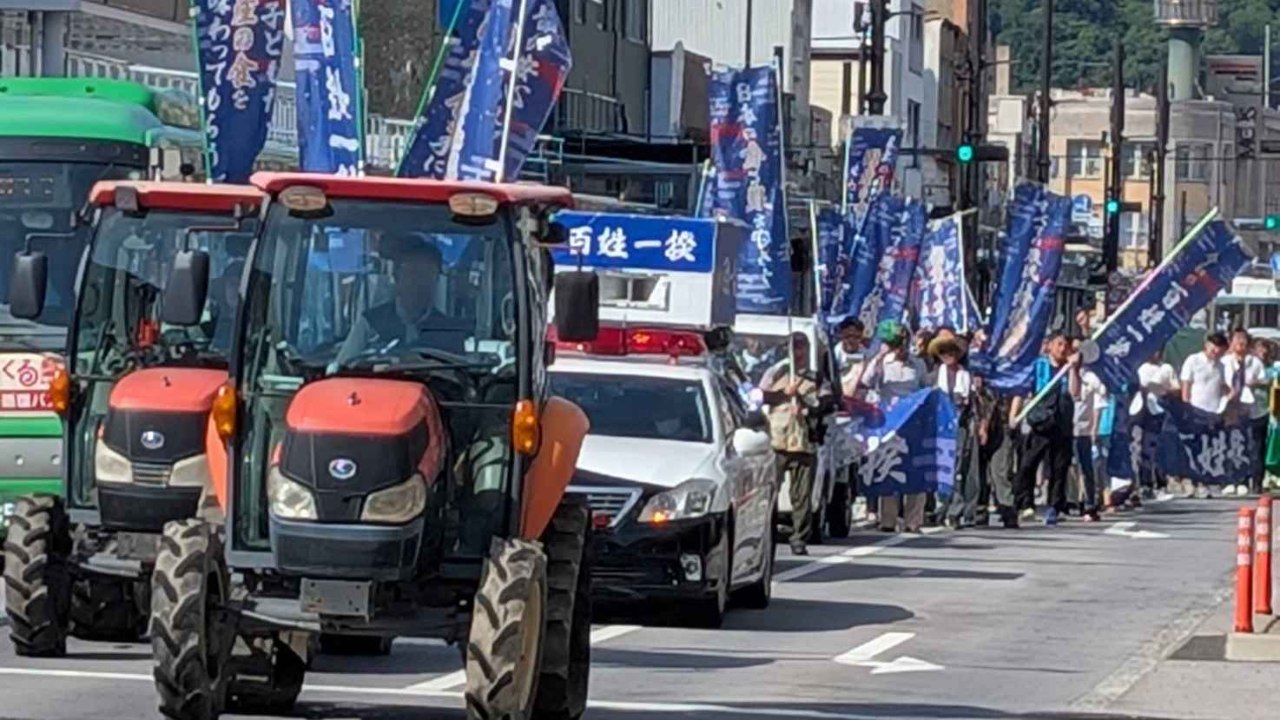 デモでは、「令和の百姓一揆」の横断幕や「日本の食と農を守ろう」などと書かれたのぼり旗、手製のプラカードを掲げる人も多く、「農業守ろう、国産守ろう」「みんな立ち上がれ、今が正念場」などのコールを繰り返しながら、市内のメイン通りを歩いた。