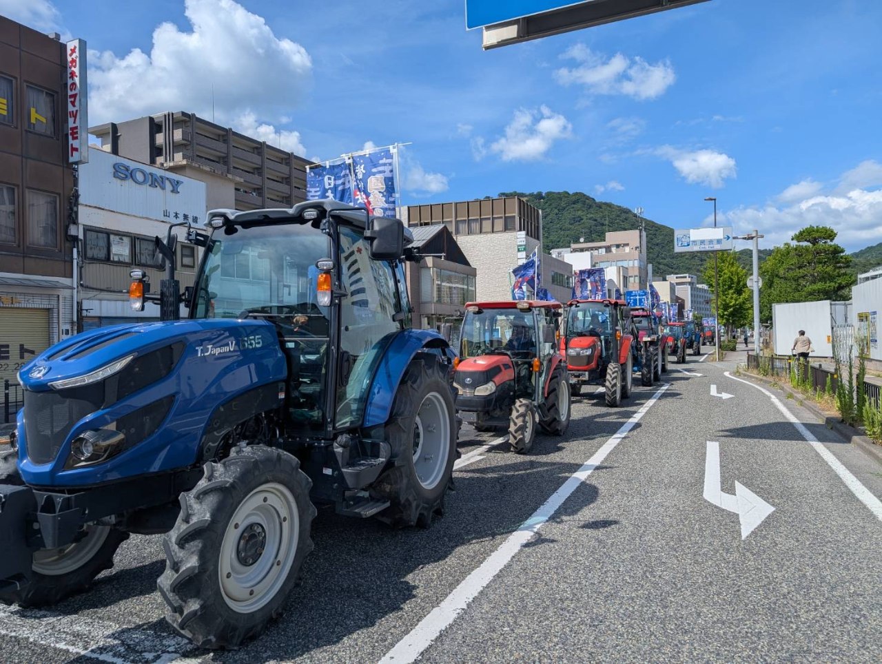 行進では、県内各地から集まったトラクターがエンジン音を響かせて出発。行きかう市民も驚きの表情で見入り、写真を撮る人も多くいた。
