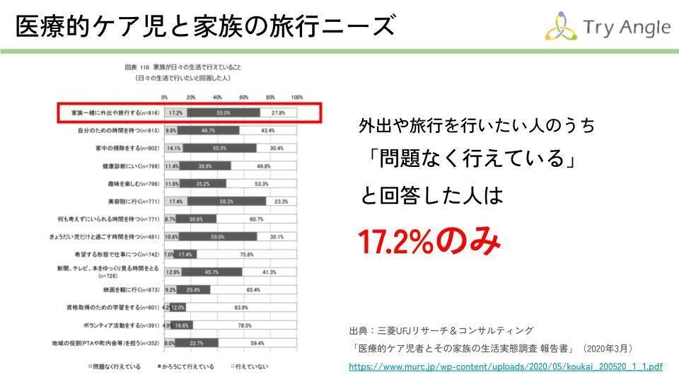 旅行のニーズはある一方で、実際に旅行に出かけるには宿泊施設の設備や周辺環境、旅先の飲食店や観光スポットのアクセシビリティ情報など事前に調べる事項も多く、医療的ケア児家庭の中には、「(医療的ケアが必要な)子どもが生まれてから旅行をしたことがない」という方も珍しくありません。
