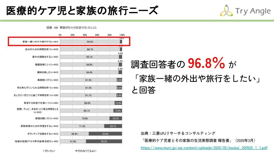 2020年に医療的ケア児のご家族を対象に行われたアンケート調査によると、回答者の96.8%もの方が、家族一緒に外出や旅行をしたいと回答しています。
