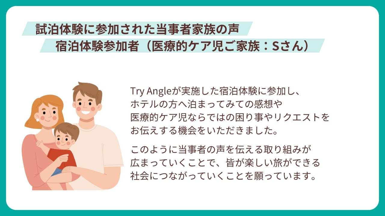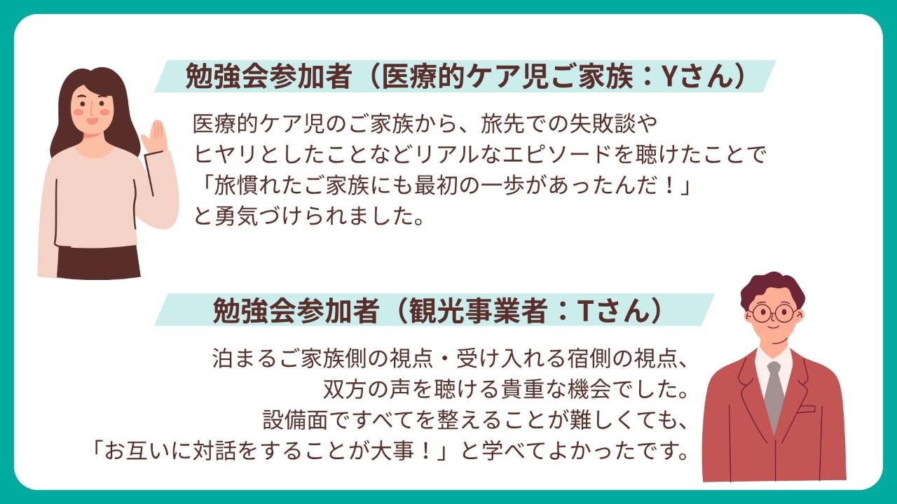地域の取り組みや宿の工夫を伝えることで、医療的ケア児と家族の“旅の選択肢”をひとつずつ増やしていきます。