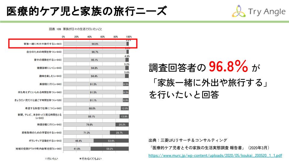 2020年に医療的ケア児のご家族を対象に行われたアンケート調査によると、回答者の96.8%もの方が、家族一緒に外出や旅行をしたいと回答しています。