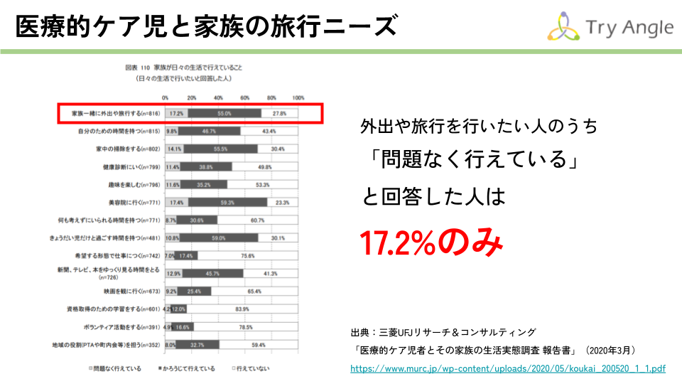 旅行のニーズはある一方で、実際に旅行に出かけるには宿泊施設の設備や周辺環境、旅先の飲食店や観光スポットのアクセシビリティ情報など事前に調べる事項も多く、医療的ケア児家庭の中には、「(医療的ケアが必要な)子どもが生まれてから旅行をしたことがない」という方も珍しくありません。