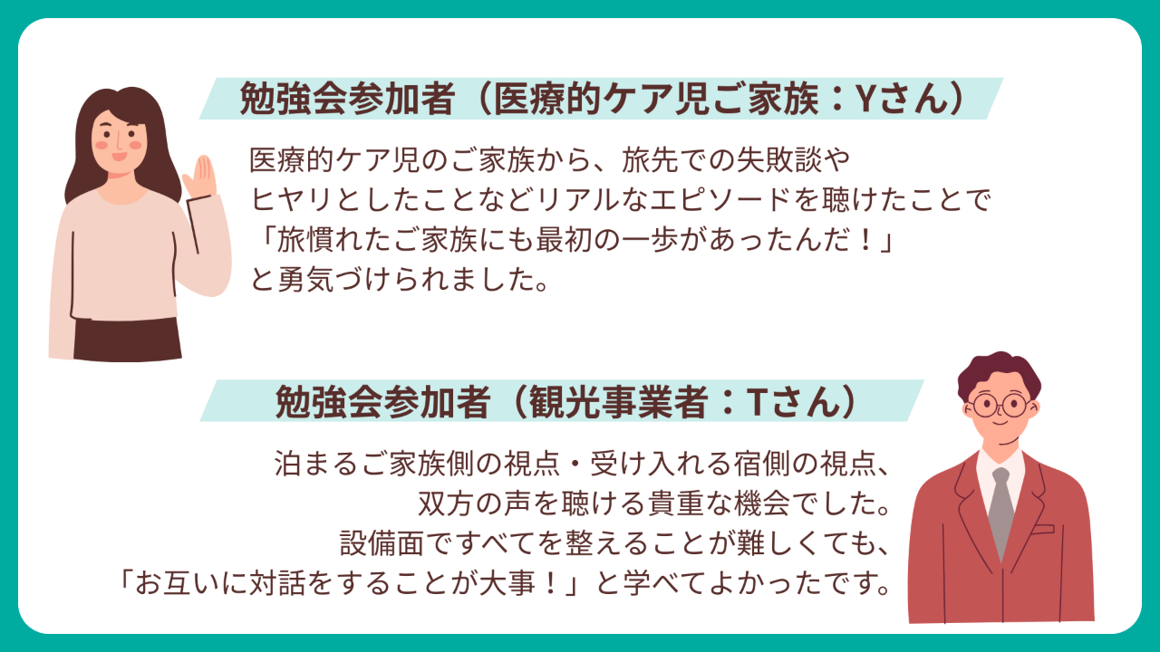 旅行や外出には、宿泊先の宿だけでなく、その地域における観光事業者や医療・福祉事業者、医療的ケア児とそのご家族を支援する団体など、旅の行程の中で出会い・支えとなってくれる事業者の存在も欠かせません。