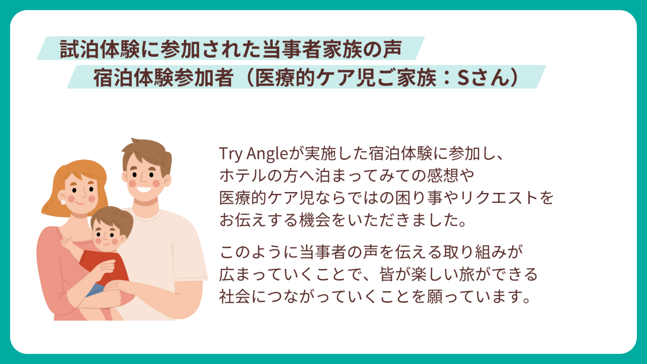 Try Angleでは、こうした旅行や外出のハードルをできるだけ解消していくため、旅行の実現に向けてガイドラインをつくり、医療的ケア児のご家族からの相談に乗ったり、宿泊事業者向けに環境整備のお手伝いや試泊の取り組みを行なってきました。