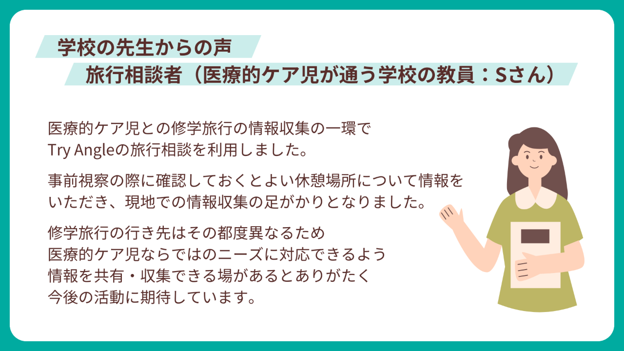 私たちTry Angleは「医療的ケア児の旅行・外出」に関わる様々な立場の方とつながり、それぞれの困りごとやニーズを聴き取り、相互理解を生み出す働きかけを行うことを自身の大切な役割と考えています。