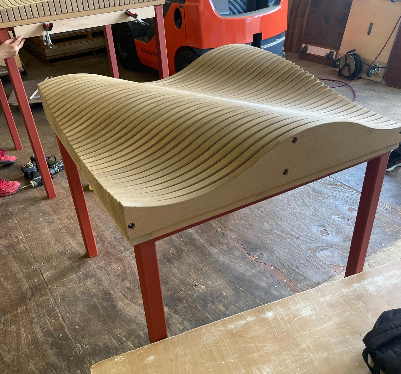 ろくまる公園に新たに設置される、様々な高さで美しく波打つオリジナルベンチの検品へ行ってきました。