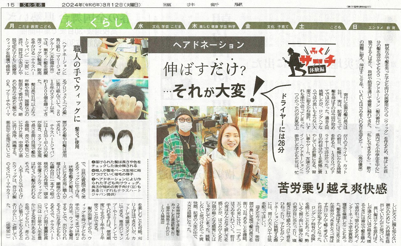 ヘアドネーションに挑戦する人、ウィッグを必要とする人、それぞれの背景や想いを知るきっかけになれば、とつな髪へ取材をしてくださったとのこと。