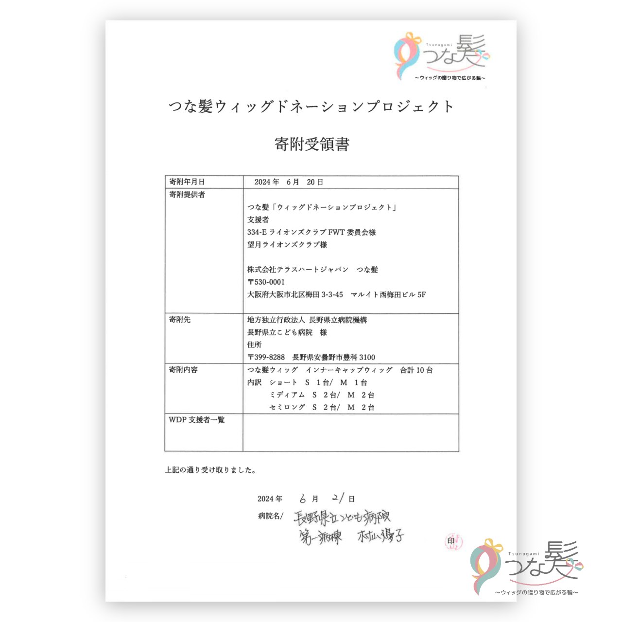 ウィッグ寄附受領書:長野県立こども病院