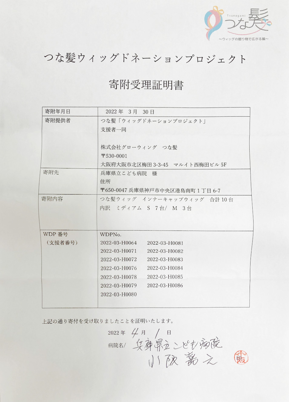 2022年3月30日にヘアドネーションの髪とWDP寄付金(病院寄付用ウィッグ制作費)で製作したウィッグを兵庫県立こども病院にお届けしました!