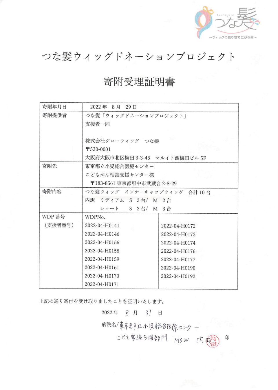 東京都立小児総合医療センターから寄附受理証明書と、ウィッグを受け取ったお子様からの手書きのお手紙がつな髪に届きましたのでご紹介いたします。