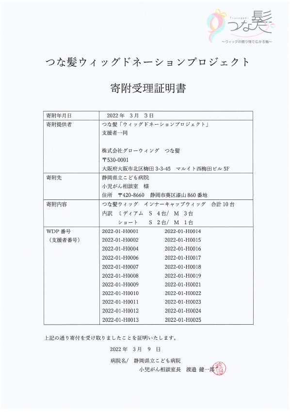 静岡県のがん患者の医療用補正具購入費への助成制度導入やヘアドネーションの周知活動をされている静岡県議員盛月寿美さんに、この度つな髪アンバサダーとして皆様の髪とWDP寄付金で制作したウィッグを静岡県立こども病院にお届けいただきました。お忙しい中皆様の想いをお届けくださりありがとうございました。