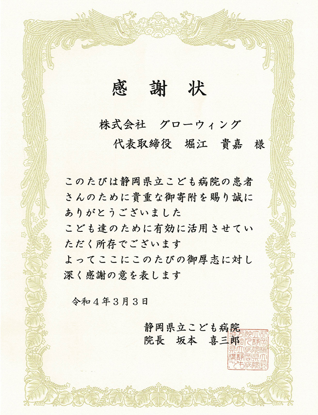 静岡県立こども病院様より感謝状もいただきました!