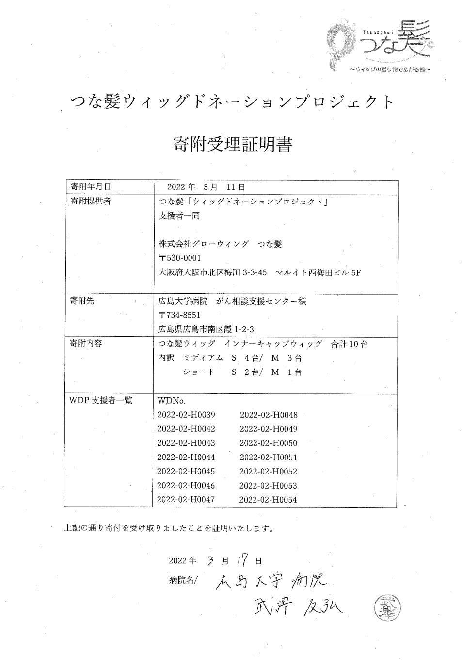 無事広島大学病院様よりウィッグとメッセージの到着のご報告と、寄附受理証明書をお送りいただきましたのでご紹介いたします。