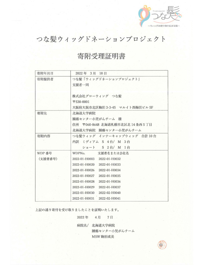 2022年3月10日にヘアドネーションの髪とWDP寄付金(病院寄付用ウィッグ制作費)で製作したウィッグを北海道大学病院にお届けしました!