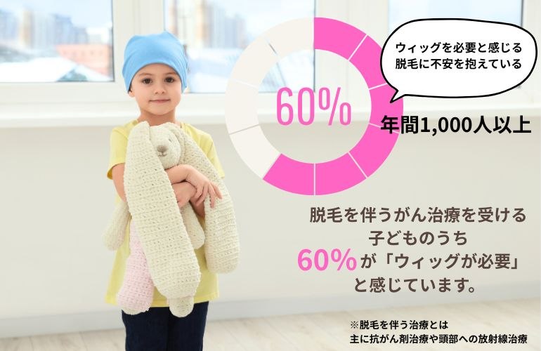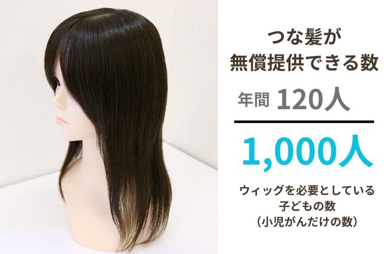 つな髪が全国の小児がん病院へ実施したアンケートでは治療を受ける子どもの約60%(半分以上が)ウィッグを必要と感じたり、髪が脱毛することへの不安を抱えている、という結果があり、年間の小児がん数から計算すると約1,000人以上になります。
