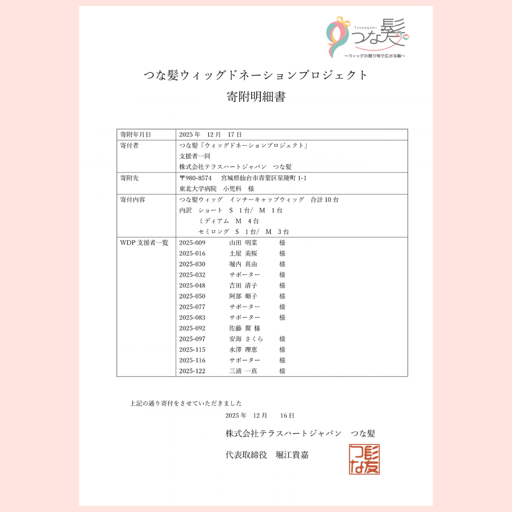 皆さまの優しさが、ウィッグを必要としている子どもたちの笑顔へとつながっていくことを心より願っております。改めまして、この度のご支援に深く感謝申し上げます。