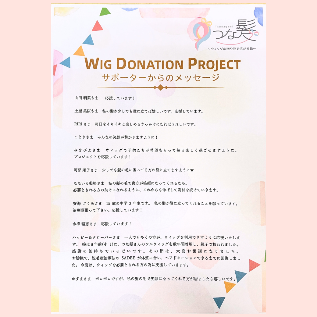 この度は、ウィッグドネーションプロジェクトへご参加いただき、また温かい応援メッセージとご寄付をお寄せいただき、誠にありがとうございます。