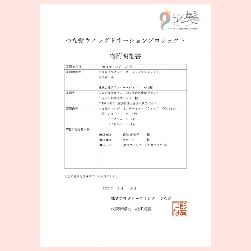 ウィッグ寄附明細書:国立成育医療研究センター