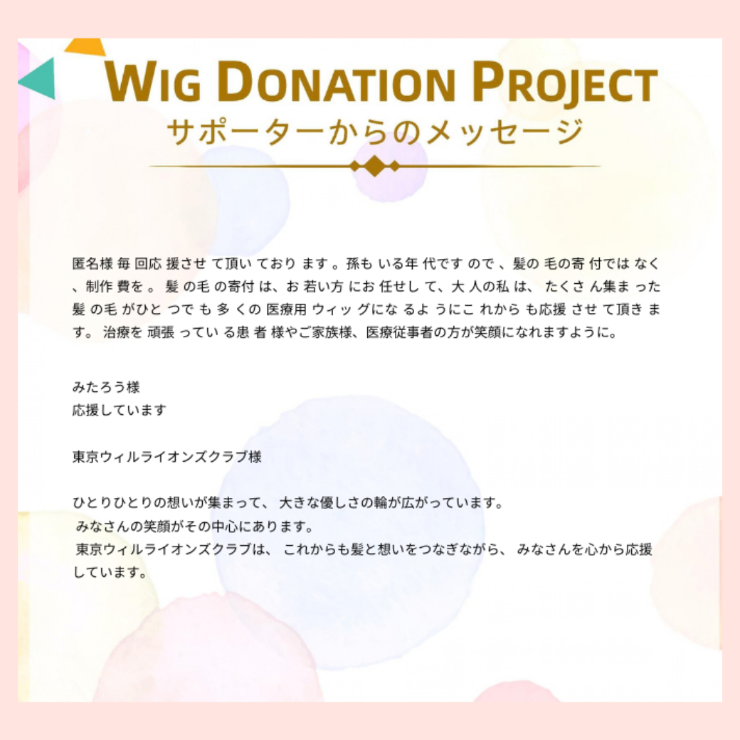 髪の寄付だけでなく、医療用ウィッグの製作費としてのご支援や、「一人でも多くのウィッグにつながってほしい」というお気持ちをお寄せいただき、スタッフ一同とても励まされております。