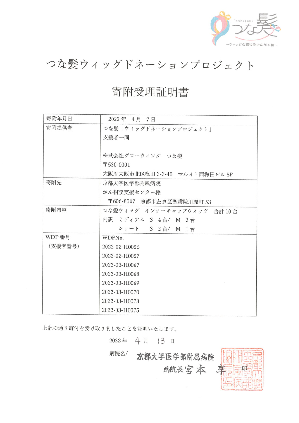 【2022/04/07】京都大学医学部附属病院にウィッグをお届けしました!!