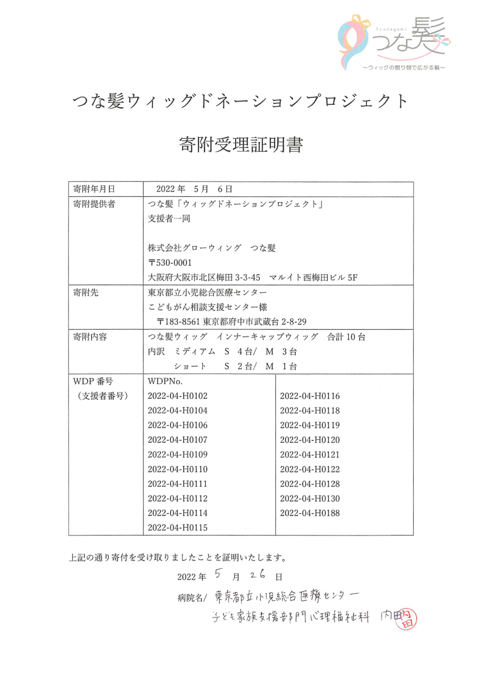 寄附受領証明書:東京都立小児総合医療センター様