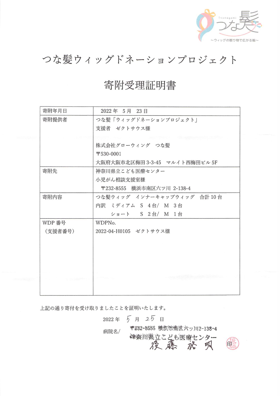 寄附受領証明書:神奈川県立こども医療センター様